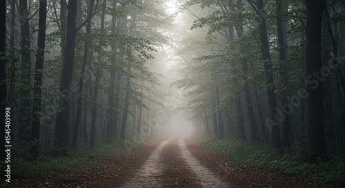 Fototapeta premium Enigmatic Forest Path: A Mystical Journey Through Misty Woods, Leading to an Unknown Destination. High quality professional stock photo suitable for commercial use.