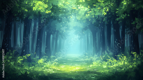 © Ahmad, Obraz premium Enigmatic forest path bathed in a gentle light beckons through dark trees and lush greenery Natures tranquility a s