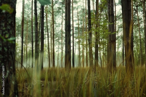 Fototapeta premium Enigmatic Forest Scene with Misty Undergrowth and Pine Trees