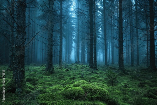 © darshika, Obraz premium Enigmatic, moss-covered forest path shrouded in a mysterious, blue-tinged fog.