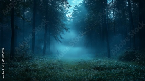 Fototapeta premium Enigmatic Night Forest: Deep Teal Mist, Mysterious Path