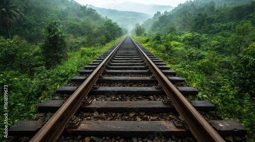 © MdNubhan, Fototapeta premium Enigmatic Railway Passage Through Lush Forest Canopy - Journey and Discovery Concept
