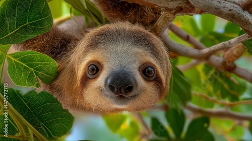 Naklejka premium Enigmatic sloth gazing curiously from lush green foliage in a tropical...