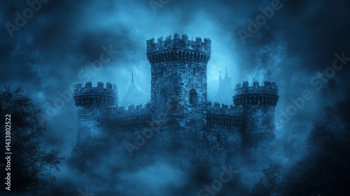 © NawasenaRid, Fototapeta premium Enigmatic Stone Castle at Night in Blue Fog