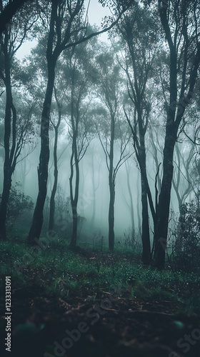 Fototapeta premium Enigmatic Woodland with Dense Tree Canopy and Thick Fog