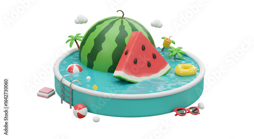 Naklejka premium Enjoy a refreshing summer day with this playful illustration featuring a pool, a giant watermelon, and fun beach elements.