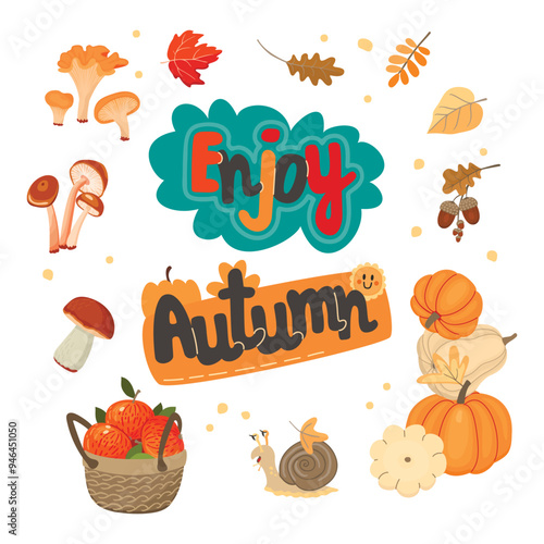 © Alla, Fototapeta premium Enjoy Autumn poster with edible mushrooms,fall leaves,pumpkins,acorn,cute snail, handwritten, basket of apples.Autumnal cartoon card with forest and farm harvest.Vector design set isolated on white.