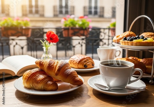 Obraz premium Enjoy fresh croissants and coffee with a book on a bright sunny morning in Paris