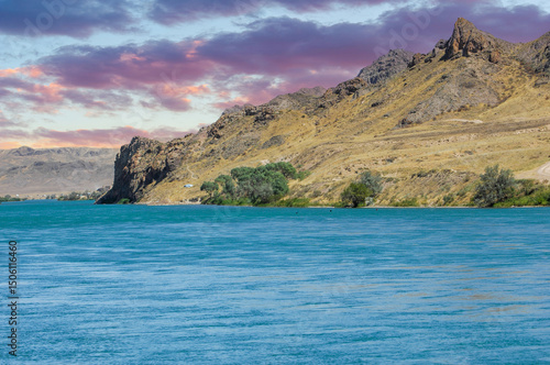 Naklejka premium Enjoy the beauty of nature in all its glory. Watch the sun set over the calm river. Enjoy the majestic mountains and lush green trees surrounding you.
