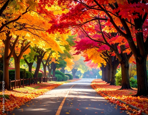 Naklejka premium Enjoy the season by taking a walk along a quiet road surrounded by colorful...
