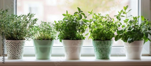 Fototapeta premium Enjoy the vibrant greenery of various herbs thriving on a windowsill.