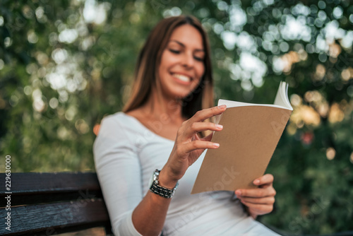 Fototapeta premium Enjoying a book outdoors. Girl reading a book on a bench in the park. Focus...
