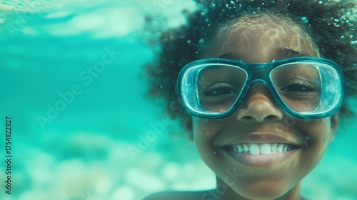 © tashechka, Fototapeta premium Enjoying a sunny day while swimming underwater with a big smile