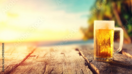 Obraz premium Enjoying cold beer on wooden table by the beach at sunset time