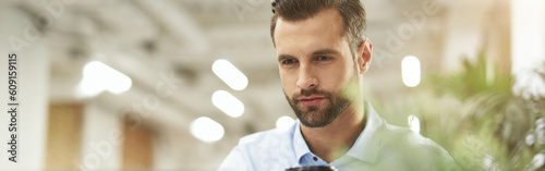 Obraz premium Enjoying morning coffee at work and checking e-mail