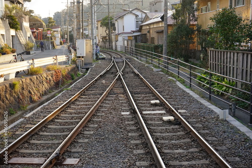 Naklejka premium Enoden Railway line merging into single line in Enoshima, Kanagawa prefecture, Japan - 江ノ電 複線から単線へ 日本