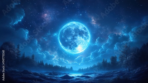 Fototapeta premium Enormous blue moon, starry night, forest silhouette.