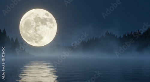 © Zidni_Design Art, Fototapeta premium Enormous Moon Over Misty Lake and Forest at Night: A Serene Night Scene