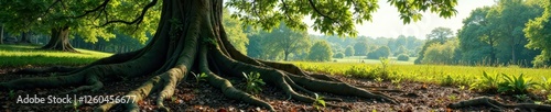 Naklejka premium Enormous tree roots sprawling across landscape, pattern, environmental, nature