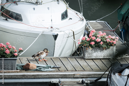 © v.poth, Fototapeta premium Ente schreitet über Bootssteg vor weißer Yacht im Sporthafen