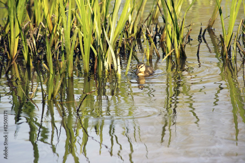 © ginton, Fototapeta premium Entenküken zwischen Schilfblättern