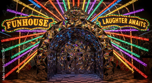 © Arisara, Obraz premium Enter the Whimsical Whisk Funhouse Where Laughter Await Amidst Dazzling Lights