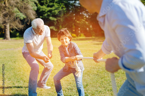 Fototapeta premium Enthusiastic committed fun men tugging the rope