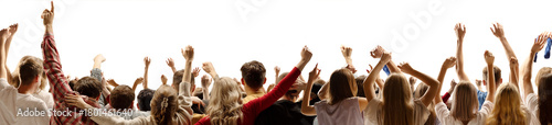 Fototapeta premium Enthusiastic people raising hands in energetic crowd scene on transparent...