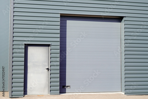 Fototapeta premium entrance roll-down facade shutters on gray building fire exit door in commercial industrial unit