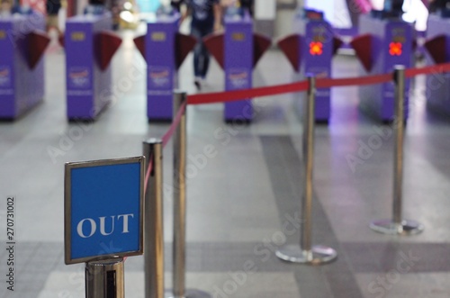 © coolbkk, Obraz premium Entry / Exit sign against Rope Barrier Stanchion Queue Rope Barrier Posts Stands Crowd Control