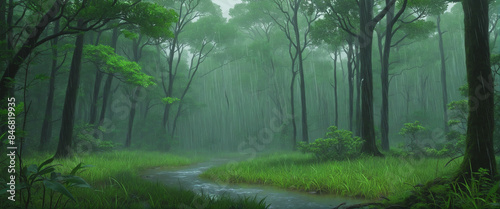 Obraz premium Enveloped in a lush woodland during the rainy spring season