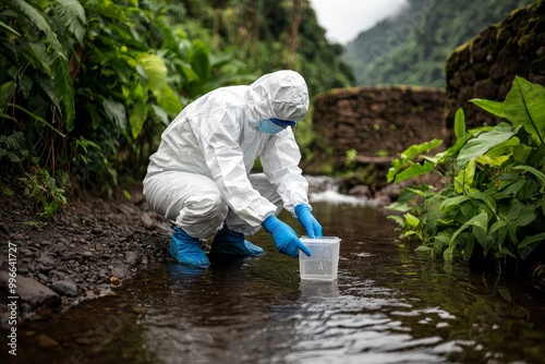 © Amara, Naklejka premium Environmental Conservation Researcher Collecting Water Samples in Lush Forest Stream - Scientific Exploration Concept
