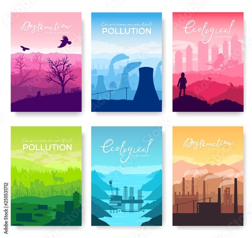 © chocostar, Naklejka premium Environmental disaster in nature landscape vector brochure cards. Set of template of flyer, magazines, poster, books, banners. lifestyle invitation concept. Layout modern page