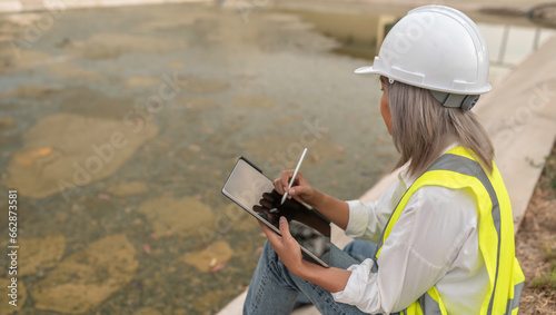 Fototapeta premium Environmental engineers work at wastewater treatment plants,Water supply...