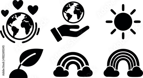© DesignVectX, Naklejka premium Environmental icons including globe with hearts hand holding earth sun leaf and rainbows