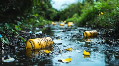 Fototapeta premium Environmental pollution with plastic waste in river streams and forest area