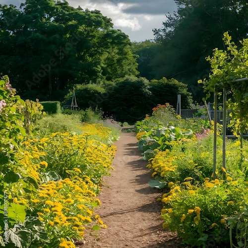Naklejka premium Envision a well-tended garden in the peak of summer. What flowers and vegetables are thriving, and how does the abundance of lifeand color influence the overall atmosphere
