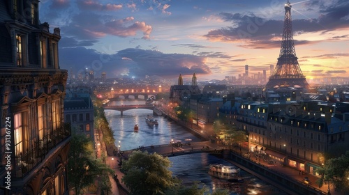 © wicha, Naklejka premium Envision the historic charm of Paris, with its iconic Eiffel Tower, quaint cafes, and romantic Seine River.