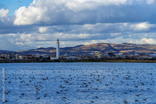 Obraz premium Envol de canards dans une vaste zone humide aux alentours de Tunis