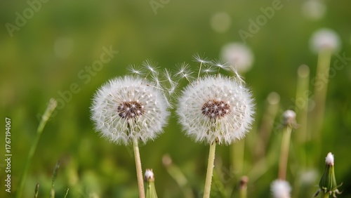 © Donald, Fototapeta premium "Ephemeral Connection": A magical realism image showing two dandelion seed heads (puffy white) side-by-side in a gentle breeze.