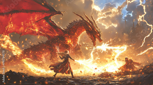 © Thiago, Fototapeta premium Epic battle between girl and electric dragon. anime fantasy illustration art. Medieval Battle. Illustration