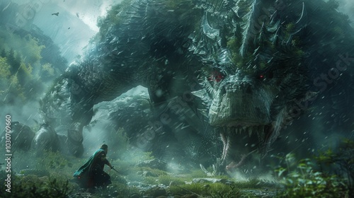 © Niphaphan, Fototapeta premium Epic battle scene featuring a hero clashing with a massive scaled beast in a rich, enchanted woodland