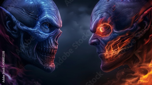 Fototapeta premium Epic confrontation between two menacing skulls, one engulfed in blue flame and the other in fiery red, set against a dark ominous background.