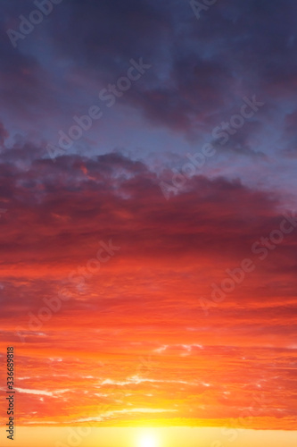 © Viktor Iden, Naklejka premium Epic dramatic sunset, sunrise red orange sky with clouds, sun and sunlight