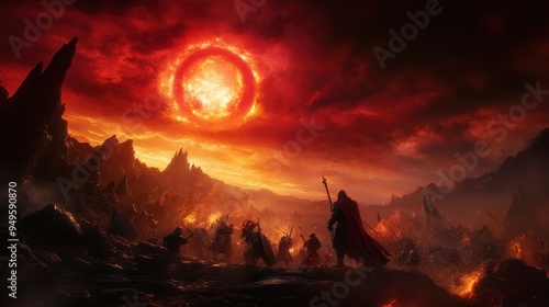 Fototapeta premium Epic Fantasy Battle Scene with Warriors Under Fiery Sky and Glowing Red Sun in Dramatic Landscape