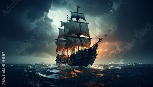 Fototapeta premium Epic Galleon Sailing Through a Dramatic Stormy Sea
