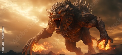 © Ania, Obraz premium Epic ifrit kingkong throll Pegasus War fly in fire, ai generative