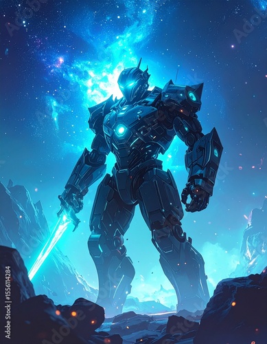 Fototapeta premium Epic mech warrior robot standing in front of a galaxy with bright turquoise...