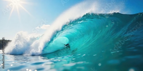 © Sathaporn Buarabut, Obraz premium Epic ocean wave curling, sunlit water spray, vibrant blue sea, exhilarating watersport action , powerful, extreme
