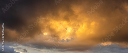 Fototapeta premium Epic panoramic view golden rain clouds during sunset or sunrise breaking...